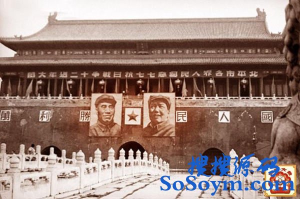 • 1949年7月7日,纪念抗战爆发12周年,天安门城楼上挂着毛泽东和朱德的相片。